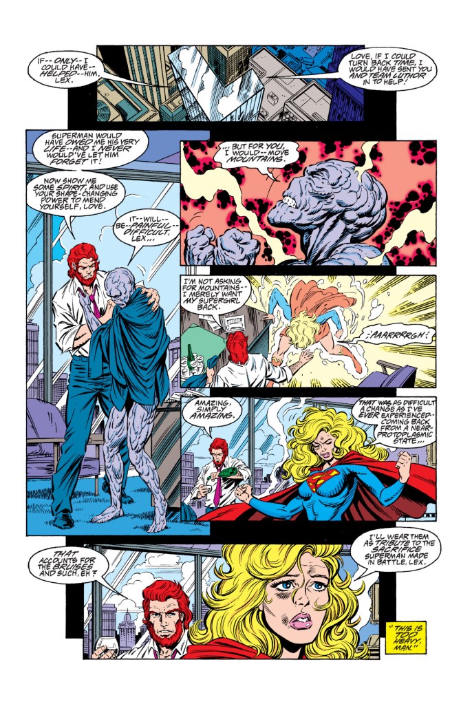 adventures of superman #498: mae is unconscious in her protomatter form, lying on the rubble. someone offers to help her to the hospital, but lex says “they wouldn’t know where to begin with my supergirl, mate.” he speaks to her, saying “we’ll make it all better, love.” she says she was crawling to try to get to superman to help him. lex says nobody can help him now, but she can still be helped. he gets her to his building and asks her to shapeshift into supergirl. she says it will be extremely painful- but that she would move mountains for him. he says he’s not asking her to move mountains— he just wants his supergirl back. he pours himself a glass of wine. she shapeshifts, and says that it was the most difficult shift of her life. he mentions her bruises, and she says she’ll wear them as tribute to superman.