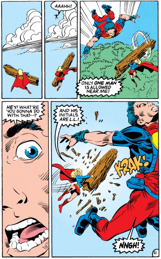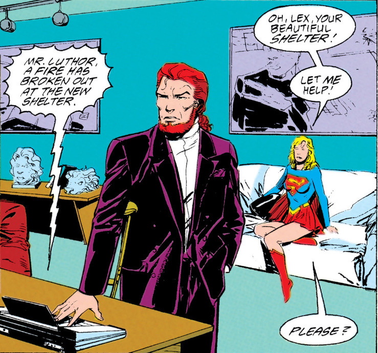 supergirl/team luthor special: opens on lex luthor promoting mae (and team luthor) as a replacement for superman (though he doesn’t phrase it as such). refers to her as a ‘beautiful young lady’ and ‘the bold young girl of steel’. note the repeated references to her youth. he recounts a story of her saving a child and her cat from a fire. this is all presented to the city council to ask for police rights. later, mae and lex (accompanied by other members of team luthor) go to stop a violent take over and hostage situation at S.T.A.R. labs. lex, overconfident, ends up with a broken leg. mae tries to cheer him up by shapeshifting into a few pop-culture references from ‘i love lucy’, ‘star wars’ and ‘male call’. that doesnt work, so she shifts into his mother, which causes him to have an epiphany. mae takes this as having cheered him up. mae helps some team luthor people who got caught in a training sequence, and happersen and lex watch from above. happersen says ‘perhaps we should simply use supergirl to greater advantage’ and lex replies ‘yes, i most certainly shall’. then, we cut to mae shapeshifted into the hellgrammite to scare someone who had called on the actual hellgrammite in an attempt to assassinate lex. lex records his fearful confession, and then goes to mae. he says ‘i never realised just how much pain this would cause you’, mae says that usually it doesnt, but the hellgrammite was inhuman and large. lex says ‘i’ll never forgive myself for putting you through such pain’ (lie, see adventures of superman #498 for the last time he asked her to do something excruciatingly painful). she says the pain doesnt matter- and he says it does, and that she should get nominated for an academy award for her acting as the hellgrammite. she says she’d do anything for him. he says ‘you are my most precious gem’ and ‘i wish i had a hundred of you’.