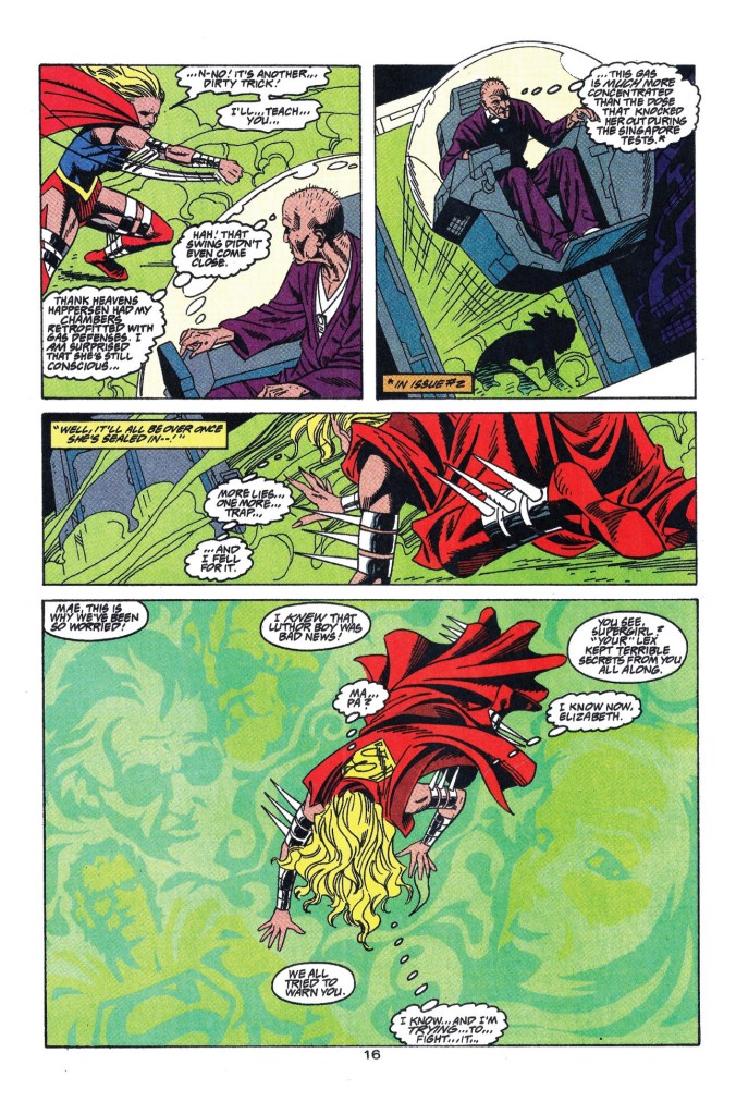 supergirl #1: opens on lex performing some tests on mae with fire and other attackers. afterwards, he sends her to gretchen, who begins to do her own tests- first making sure to cover the cameras lex has installed, much to his chagrin. she asks mae about her age, and she speaks about her origin with pocket luthor, and how she’s actually not sure of her own age. after she leaves, kelley chastises lex for exploiting an innocent child, before lex mentions being tired and kelley drops the subject. mae escapes lex’s surveillance to visit ma and pa, until they question her relationship with lex and she gets too upset to stay. at the end, we see lex and happersen looking up at many egg-shaped things containing naked supergirls.