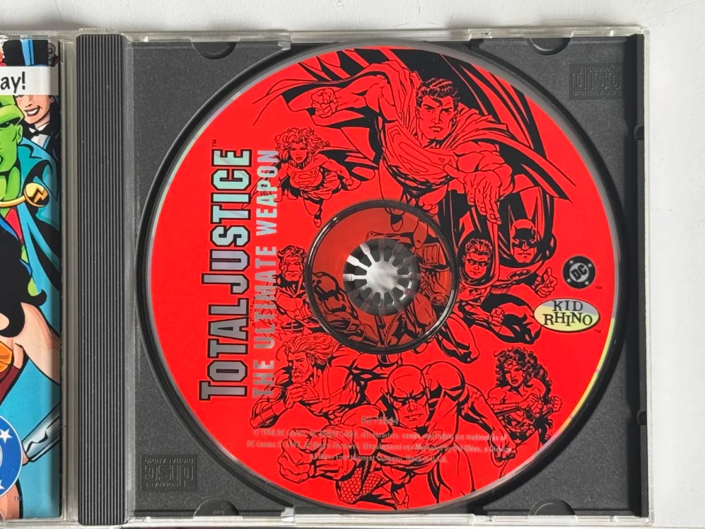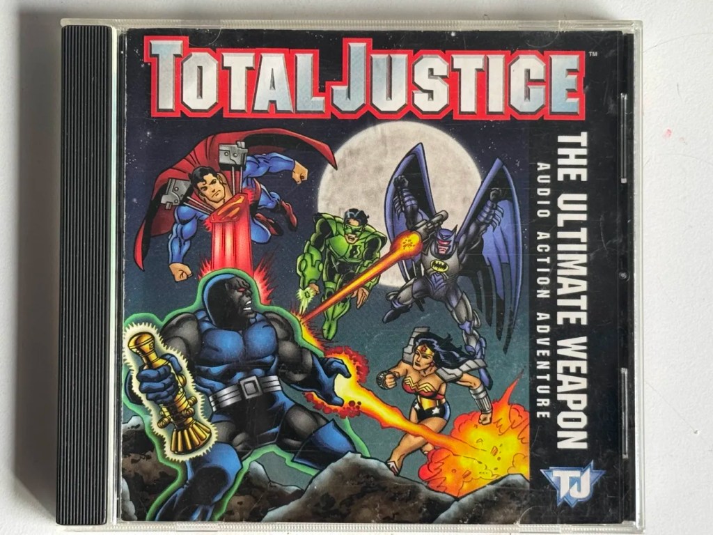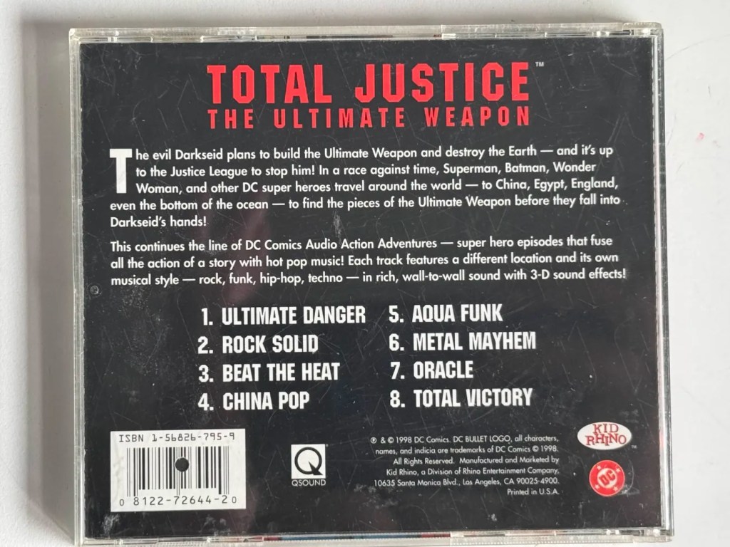 This CD came in the mail for me yesterday! She’s a little scuffed, but the CD is inside! Mae is on the CD art, but not on the case anywhere. She’s featured in episode 5, Aqua Funk. The art seems to be original to the CD, but it might be from somewhere else, as it doesn’t look like her Total Justice suit does in the coloring books, and it doesn’t seem like anyone else is in their Total Justice suits either. Very excited to have this in my collection! Now all I’m missing for her audio adaptations are the Doomsday and Beyond/Superman Lives! radio drama tape and CD.