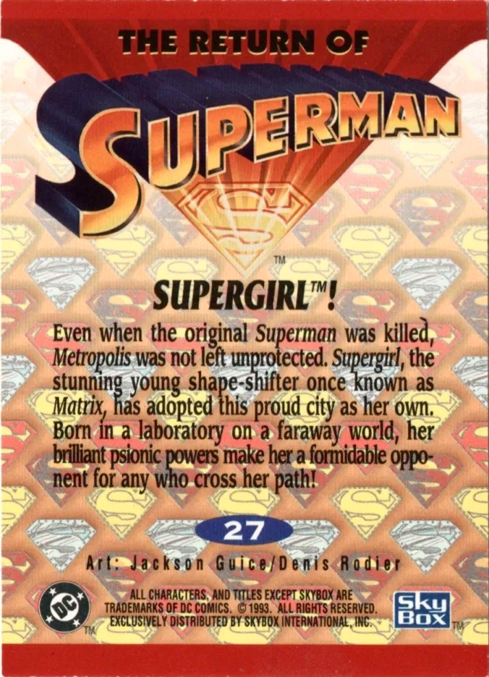7. 1993 Skybox Return of Superman #27 – Supergirl! This card features a panel from Action Comics (1938) #691, from when Her, Steel, and Superman were exploring within Engine (Coast) City. The card is notable because in the comic itself, this image is partially obscured by speech bubbles.