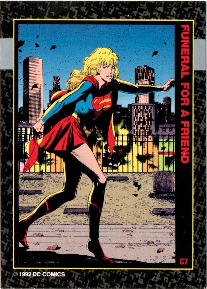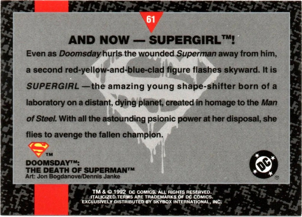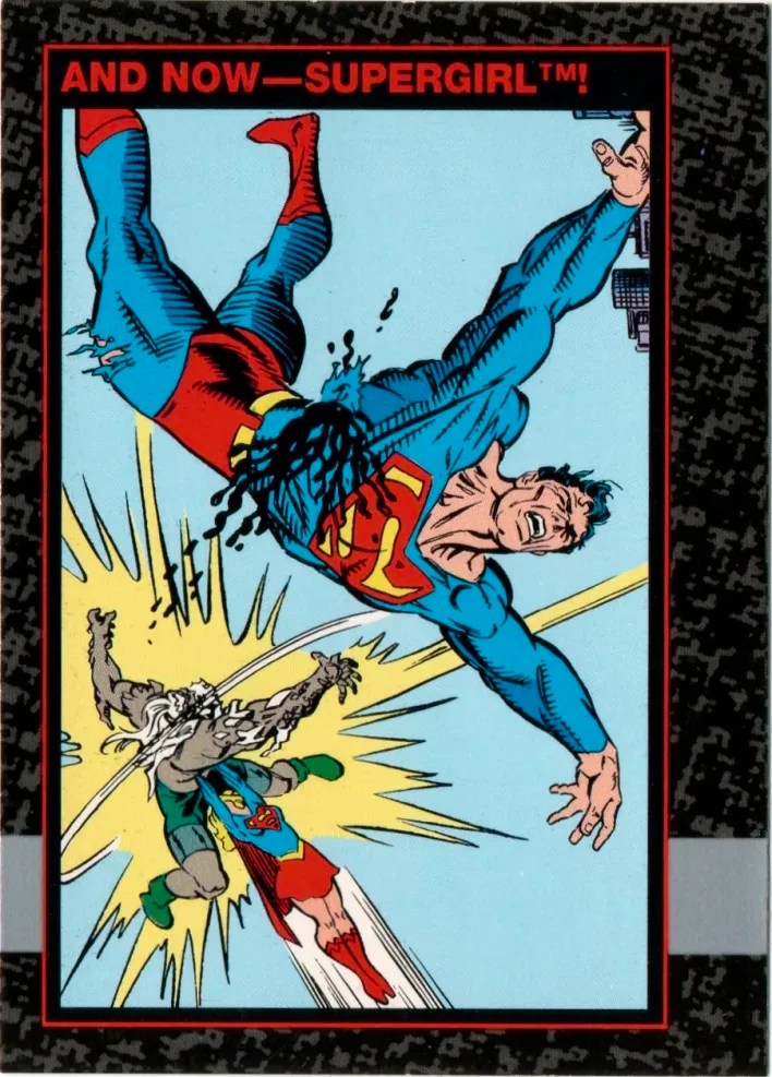1. 1992 Skybox Doomsday: The Death of Superman #61 – And Now — Supergirl. This card features the moment where Mae joins in the fight against Doomsday before failing to accomplish much of anything.