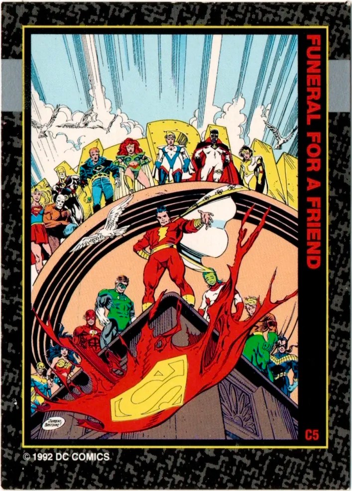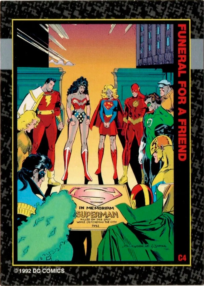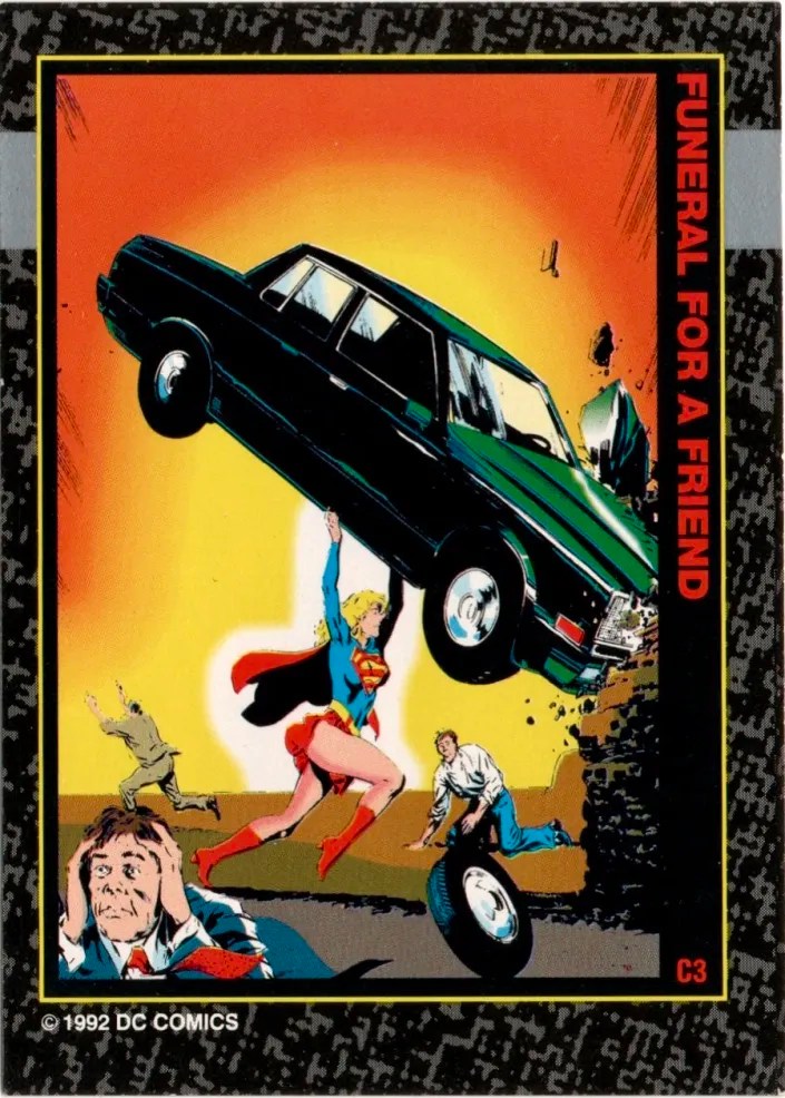 2. 1992 Skybox Funeral For A Friend #C3 – Action Comics #685, #C4 – Superman: Man of Steel #20, #C5 – Superman #76, and #C7 – Action Comics #686. The back side of this card set combines to form the Funeral for a Friend funeral procession. Each of these cards features a cover from the event.
