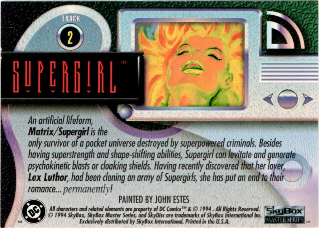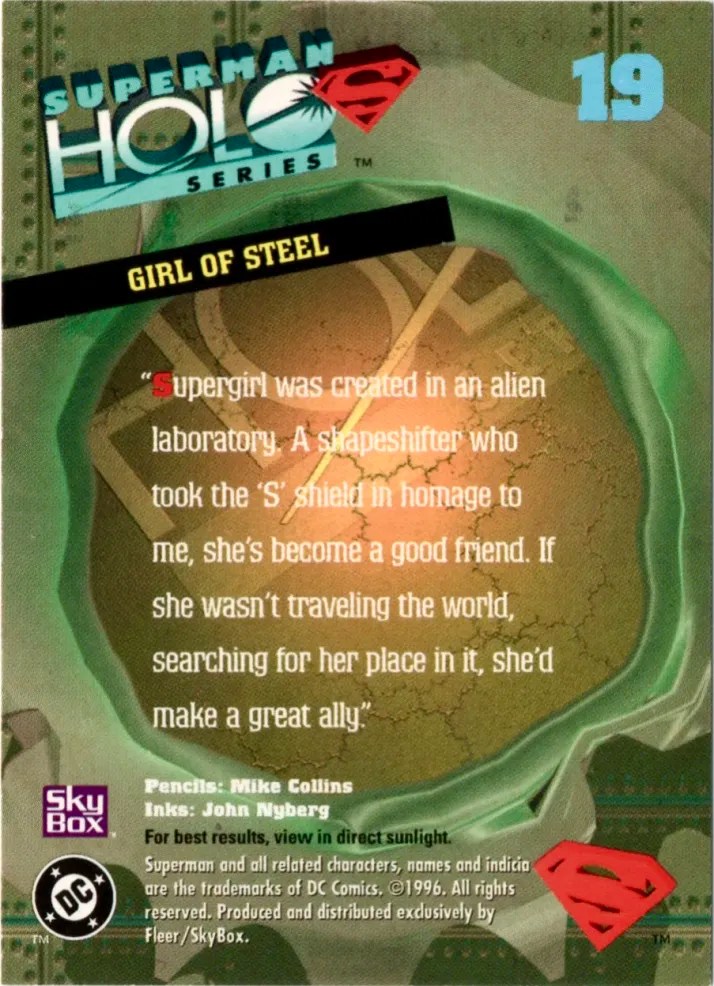 17. 1996 Skybox: Superman Holo Series #19 – Girl of Steel. See my notes for this one on the set’s individual post linked.