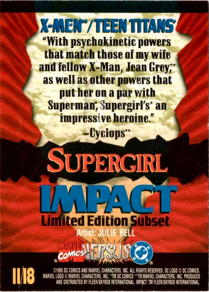 15. 1995 Fleer/Skybox: DC vs Marvel Impact #11 – Supergirl. See my notes for this one on the set’s individual post linked.