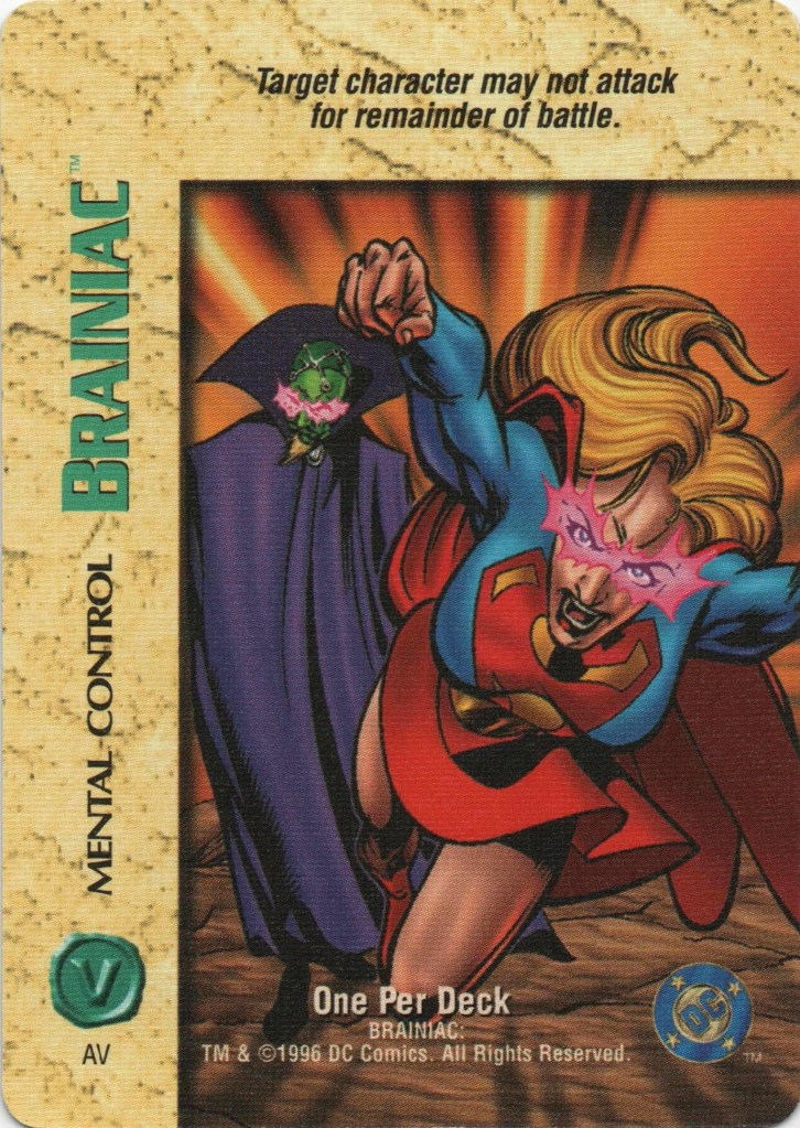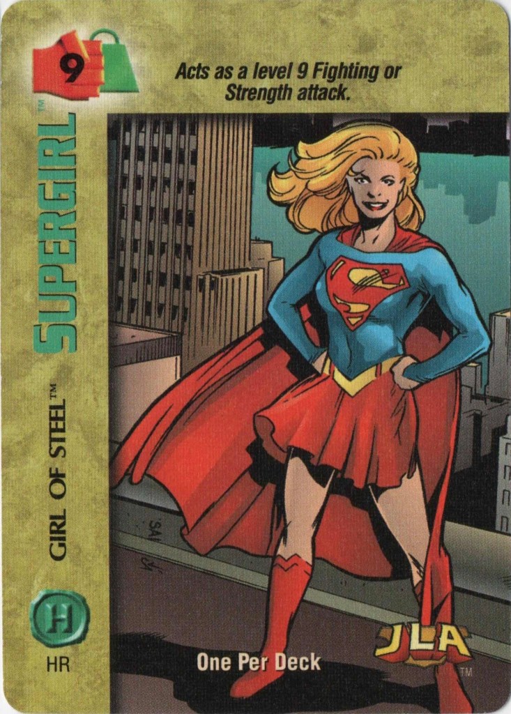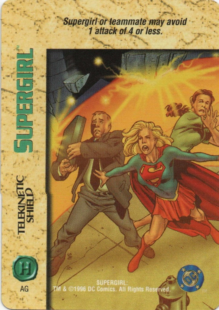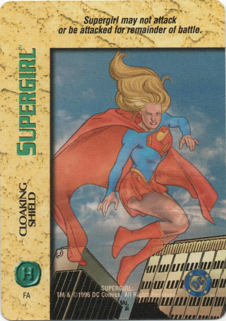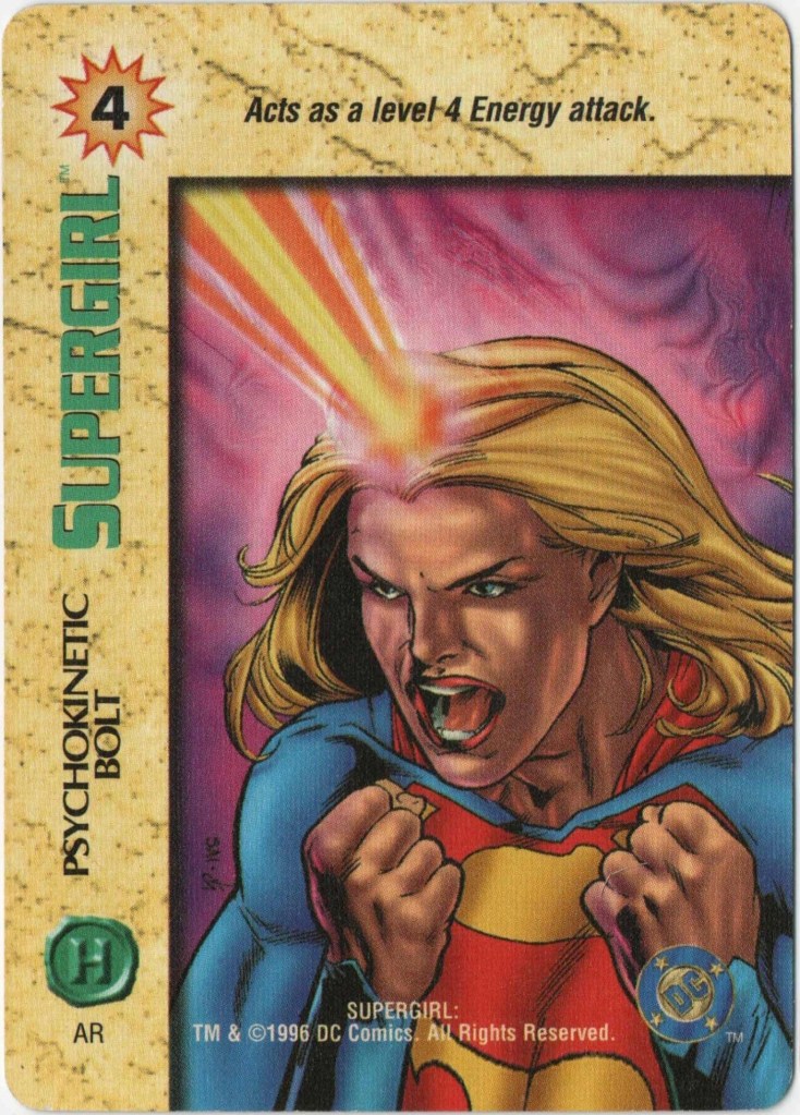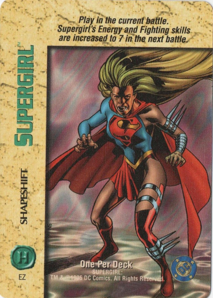 18. 1996-1997 Fleer/SkyBox Overpower TCG: Cloaking Shield, Levitation, Telekinetic Shield, Shapeshifting, Psychokinetic Bolt, Mental Control, Girl of Steel, Teamwork (Robin and Nightwing, Teamwork (Superman), Supergirl (Energy, Fighting, Strength, and Intellect), Supergirl (Plain/4). Post on this set coming soon–I need to do further research into the TCG as a whole first. If you have info, please send it to me!