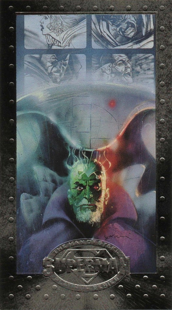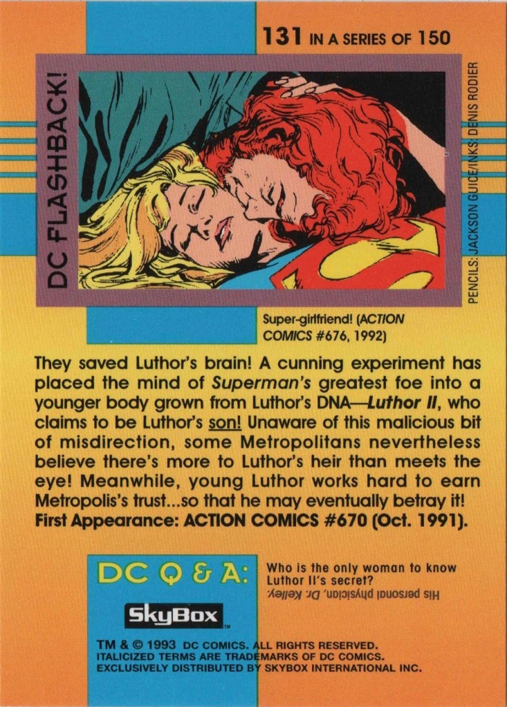 9. 1993 Skybox Cosmic Teams #131 – Luthor II. Lex appears standing on the front of this card, but on the back is this: unseen before original Butch Guice art of the two of them lying together. The note references Action Comics (1938) #676, their first meeting post-They Saved Luthor’s Brain, but this art appears nowhere in that comic. This card probably has one of the only references to Gretchen Kelley in her canonical comics form outside of those comics themselves, with the little trivia question.