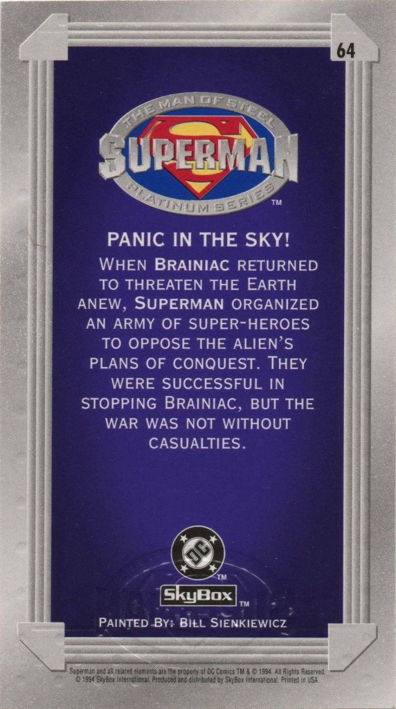 11. 1994 Skybox Superman: Man of Steel #64 – Panic in the Sky! See my notes for this one on the set’s individual post linked.
