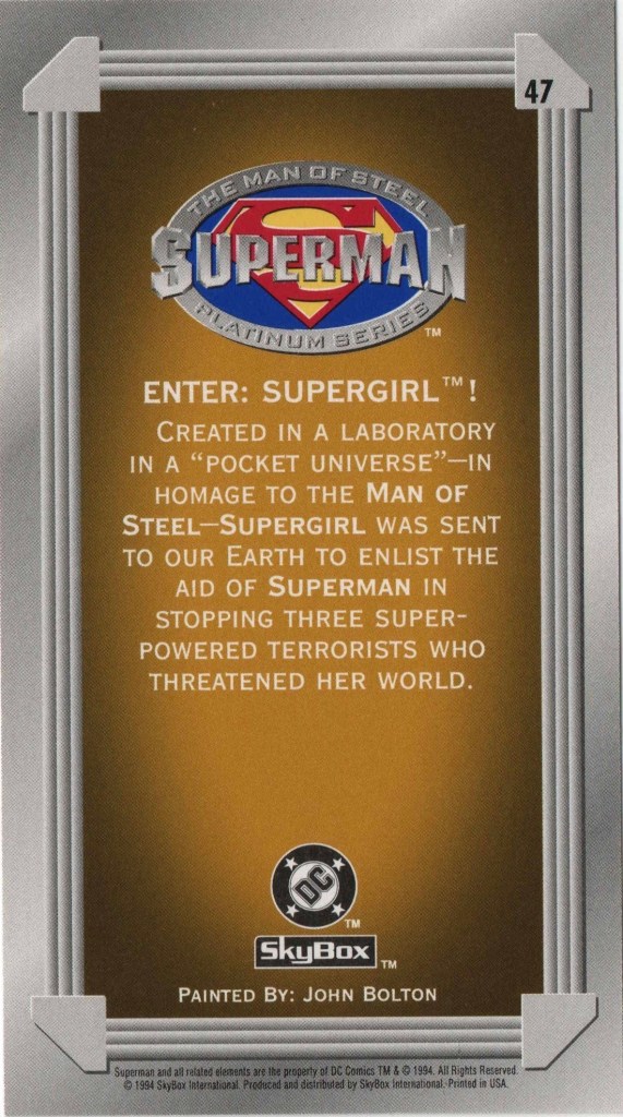 10. 1994 Skybox Superman: Man of Steel #47 – Enter: Supergirl! See my notes for this one on the set’s individual post linked.