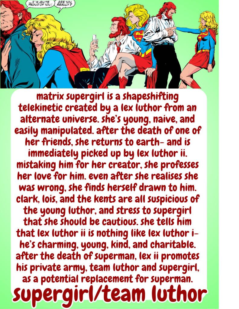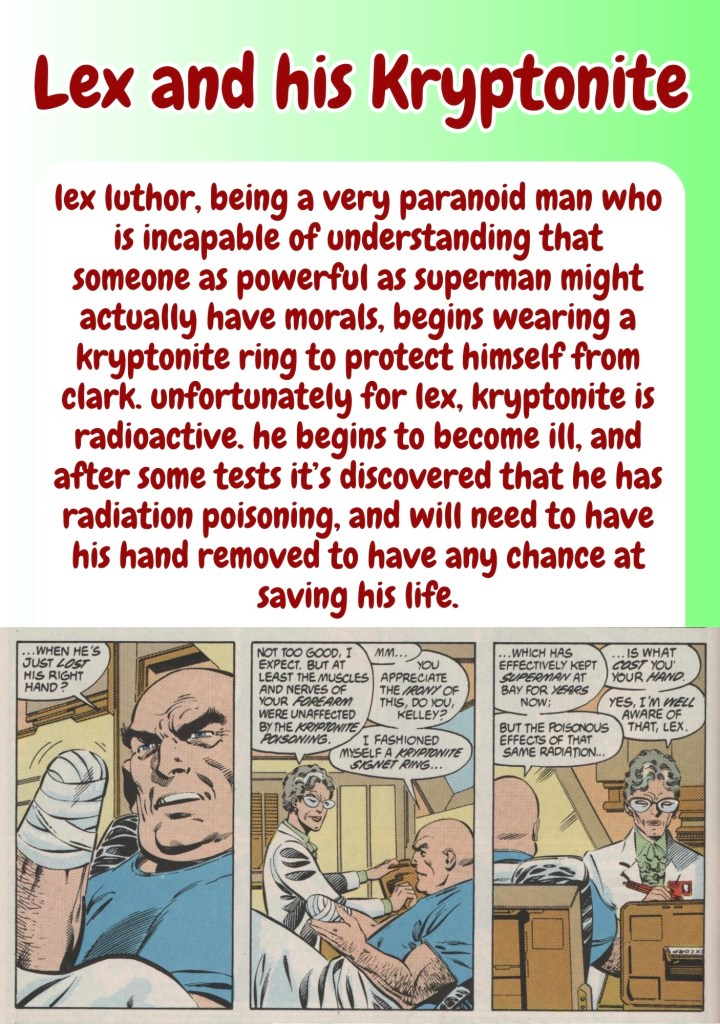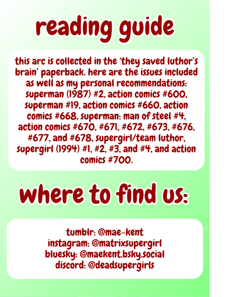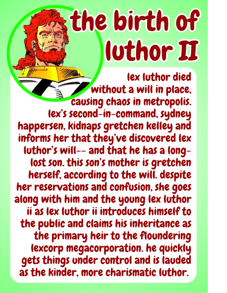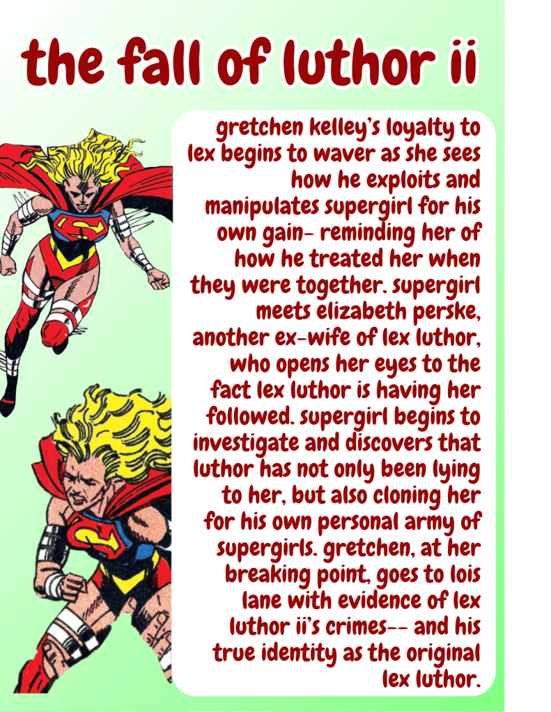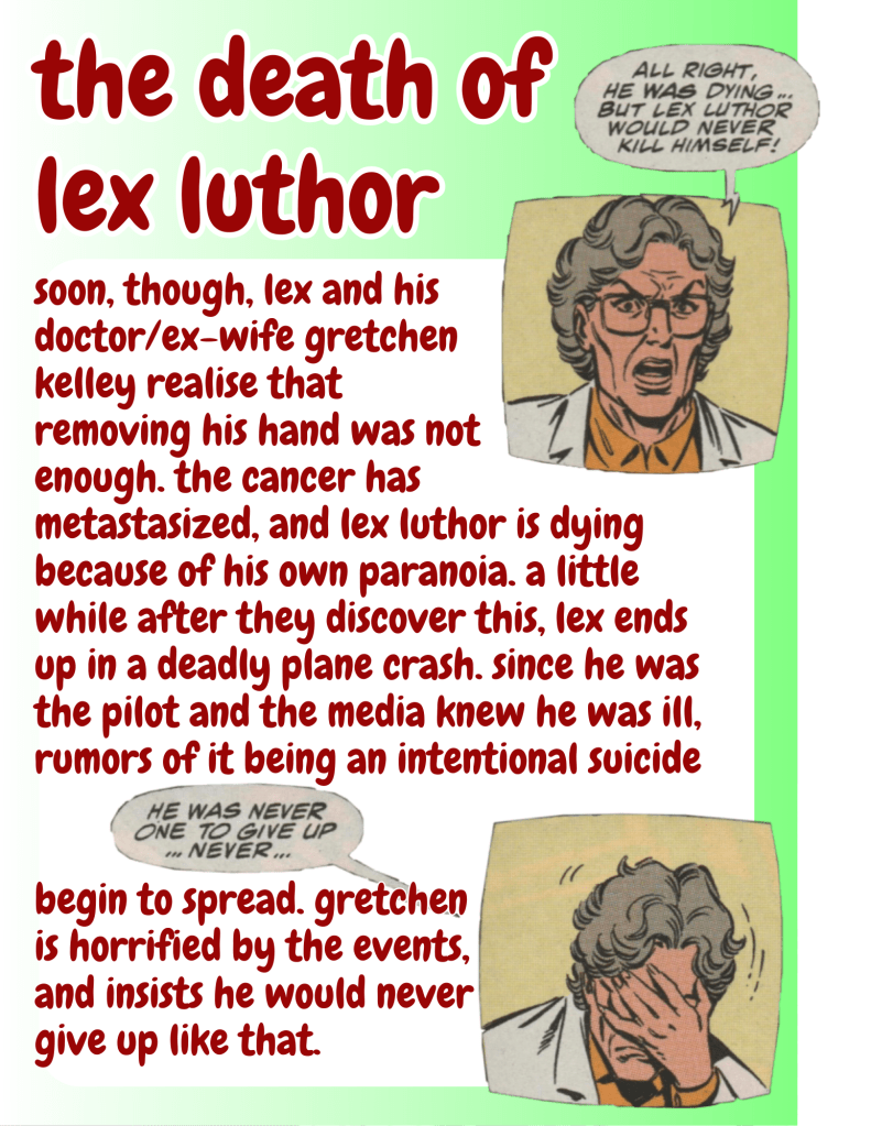 Here’s my guide zine to the ‘They Saved Luthor’s Brain’ storyline—AKA, the plotline behind why Lex is australian and hairy during his relationship with Mae. Find my zine on her and Lex’s relationship here, and find my guide to Mae in general here.