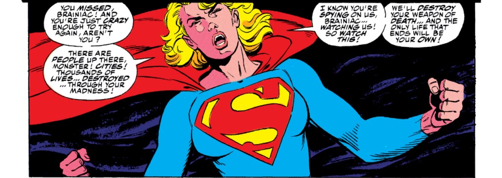 Panic in the Sky: Brainiac is trying to destroy Earth. Mae ends up in the story because she’s still disguised as Superman, but ends up being forced into her Supergirl form by Draaga. Draaga ends up sacrificing himself to save Earth, taking the only honorable (to him) option that wouldn’t hurt anyone else. She takes on the Supergirl identity permanently to honor him.
